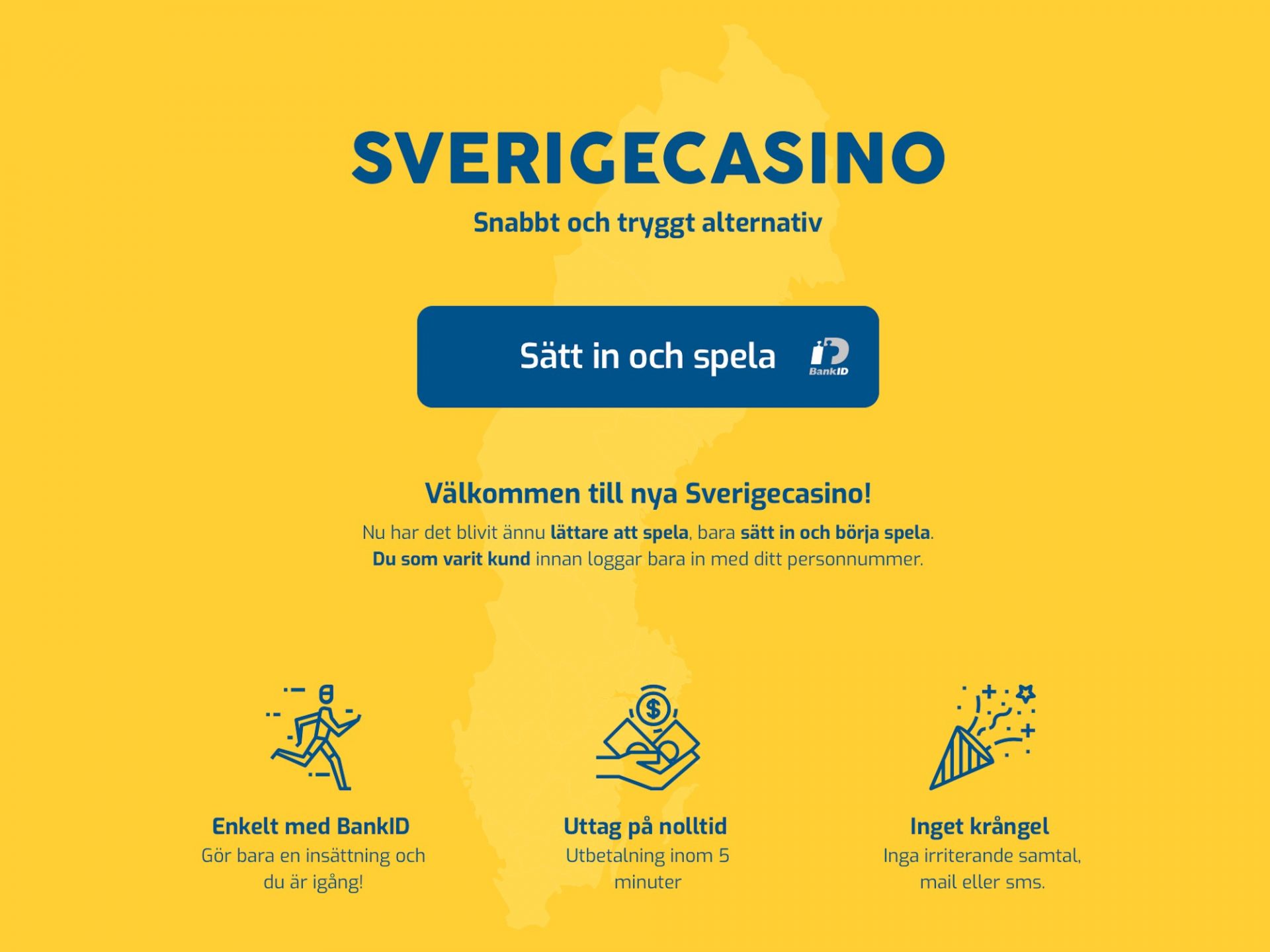Förstasidan för Sverigecasino är en av de enklaste du kan träffa på. På en gul bakgrund presenteras en knapp för ”sätt in och spela” och sajtens största konkurrensfördelar. Bakom denna introduktion döljer sig en fullfjädrad casinosajt för trygga, säkra och underhållande spel. Allt du behöver veta om Sverigecasino finner du i vår recension här.